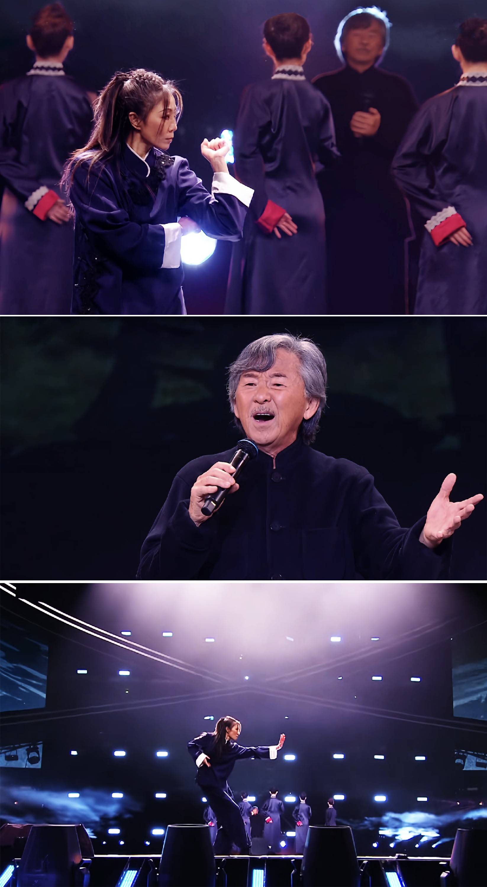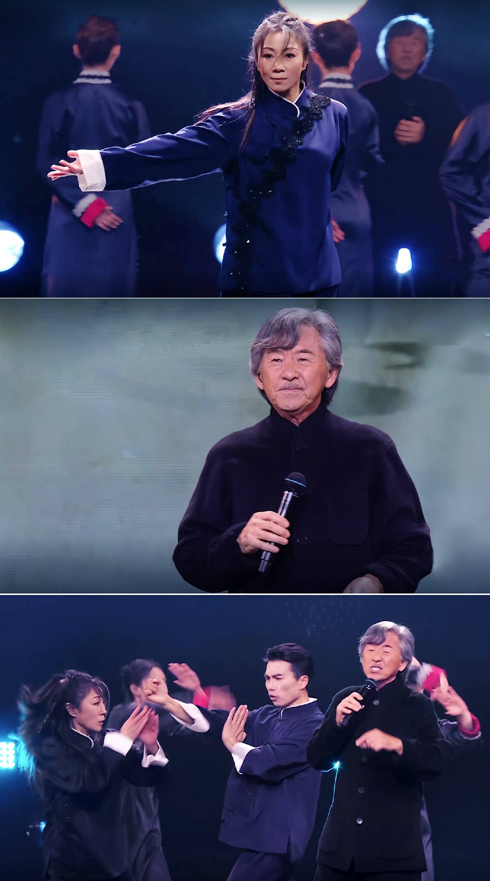 当林子祥极具穿透力的歌声响起,舞台氛围再度升级。这首刚中带柔的《咏春》主题曲,在“铁肺歌王”的演绎下兼具力量与韵味,而周小飞的武术表演则精准踩准旋律节奏,与歌声形成完美呼应。她的动作或随旋律舒展,尽显咏春的内敛细腻;或伴强音迸发,展现武术的爆发力与冲击力,刚柔并济的肢体语言与歌曲的豪迈气魄相融相生,实现了听觉与视觉的双重震撼。艺术家们的跨界碰撞,成为跨年晚会备受瞩目的舞台。