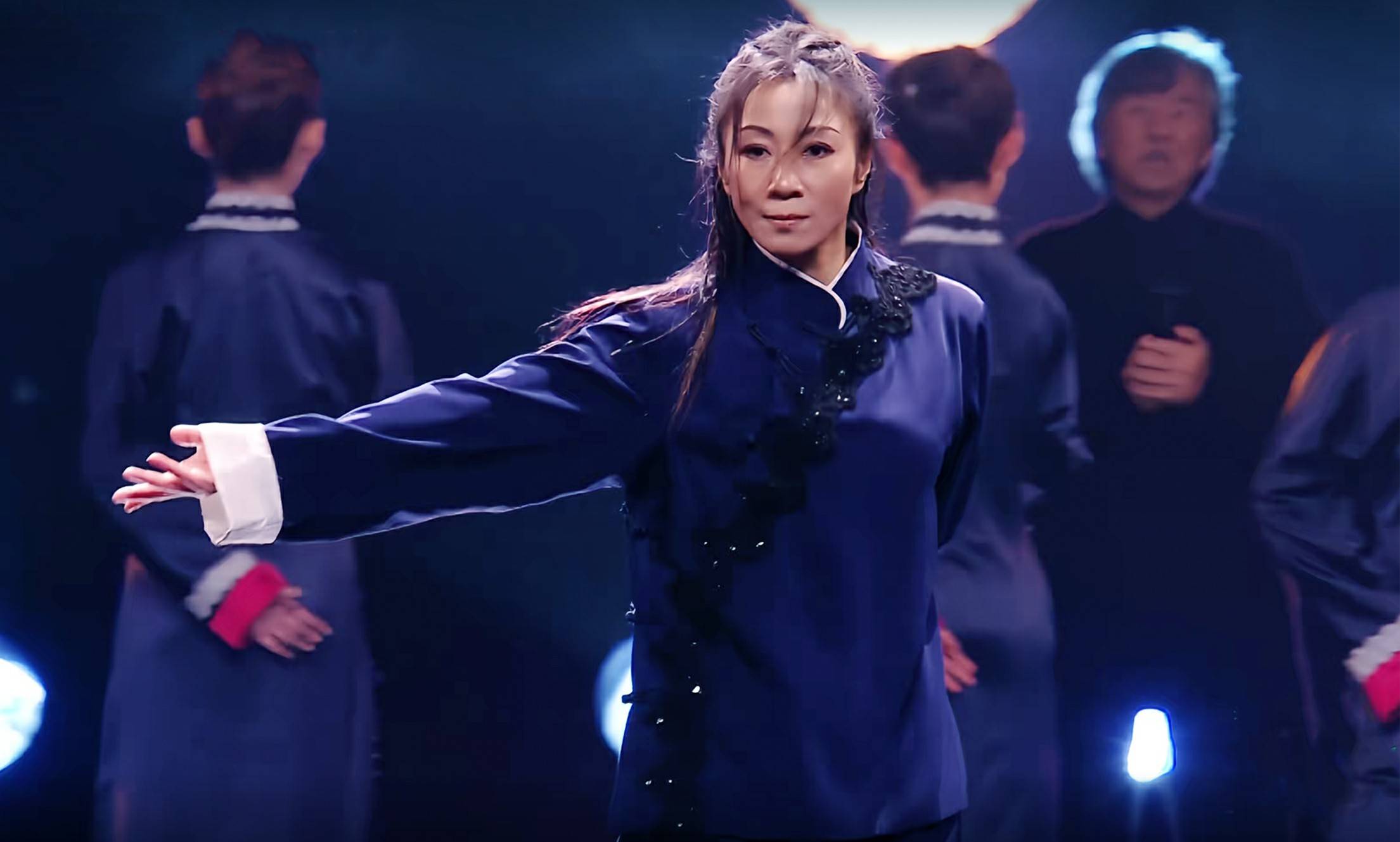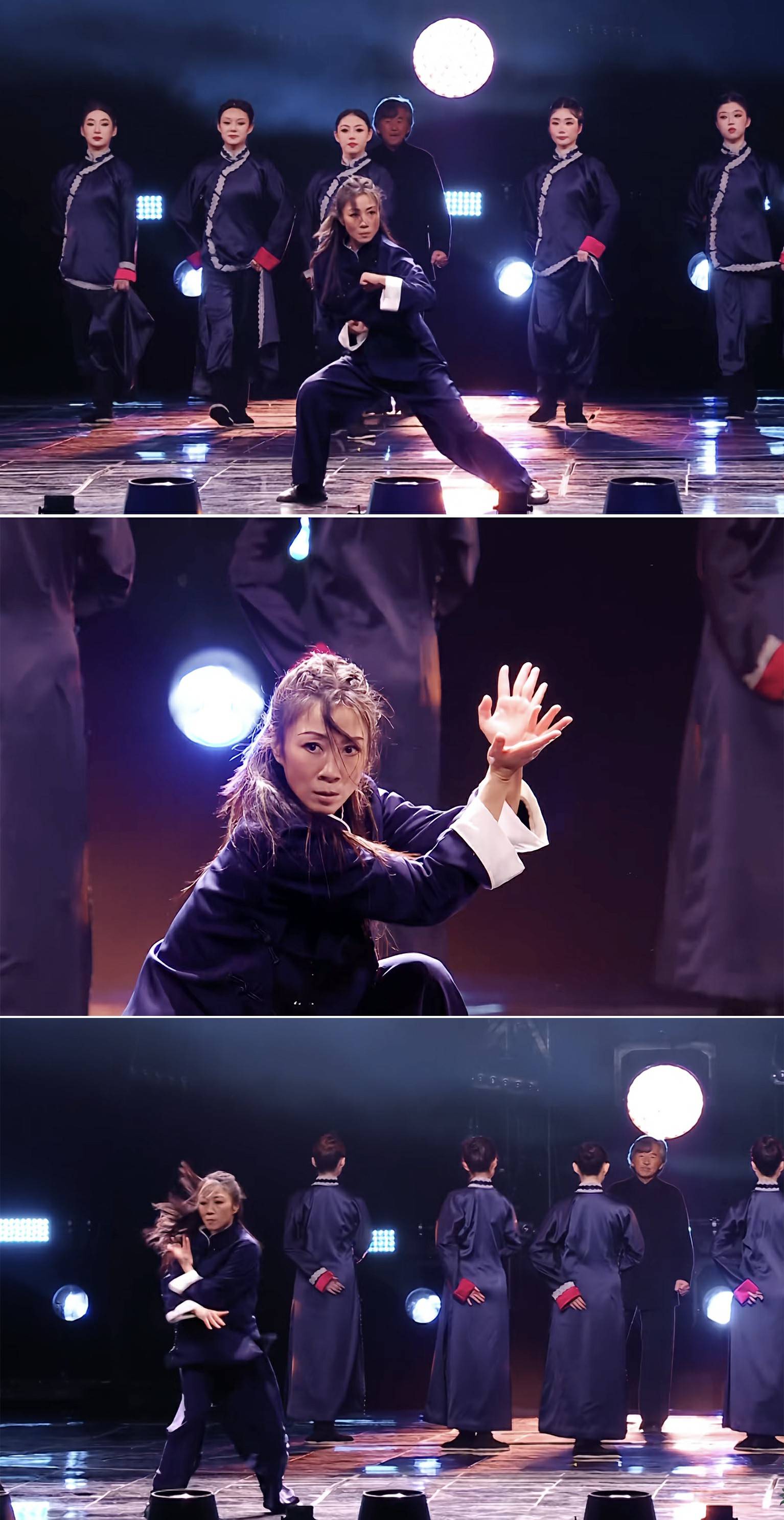 作为全国武术比赛冠军,周小飞的登场自带侠气锋芒。表演伊始,她率先带来个人solo武术秀,光影流转间,八卦掌的圆活灵动、八极拳的刚猛沉劲与咏春拳的寸劲巧思无缝衔接。一招一式精准利落,时而辗转腾挪如行云流水,时而定势凝神尽显宗师气度,将中华武术的“形神兼备”演绎得淋漓尽致,扎实的基本功与多年舞台历练沉淀的表现力,瞬间点燃全场氛围,让观众直观感受传统武术的当代魅力。